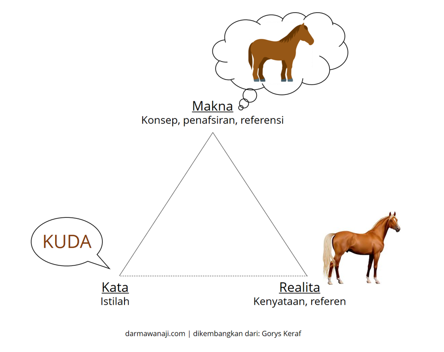 Saat saya mengatakan “kuda” – tentu saja Anda dengan mudah memahami maknanya. Kuda adalah binatang berkaki empat, berkuku satu, menyusui, biasa dipiara orang sebagai kendaraan (tunggangan, angkutan) atau penarik kendaraan dan sebagainya. Anda memahami kata kuda karena Anda bisa memikirkan atau membayangkannya. Anda bisa memikirkan atau membayangkan kata kuda karena Anda pernah melihat kuda secara nyata (secara langsung atau melalui rekaman gambar/video).